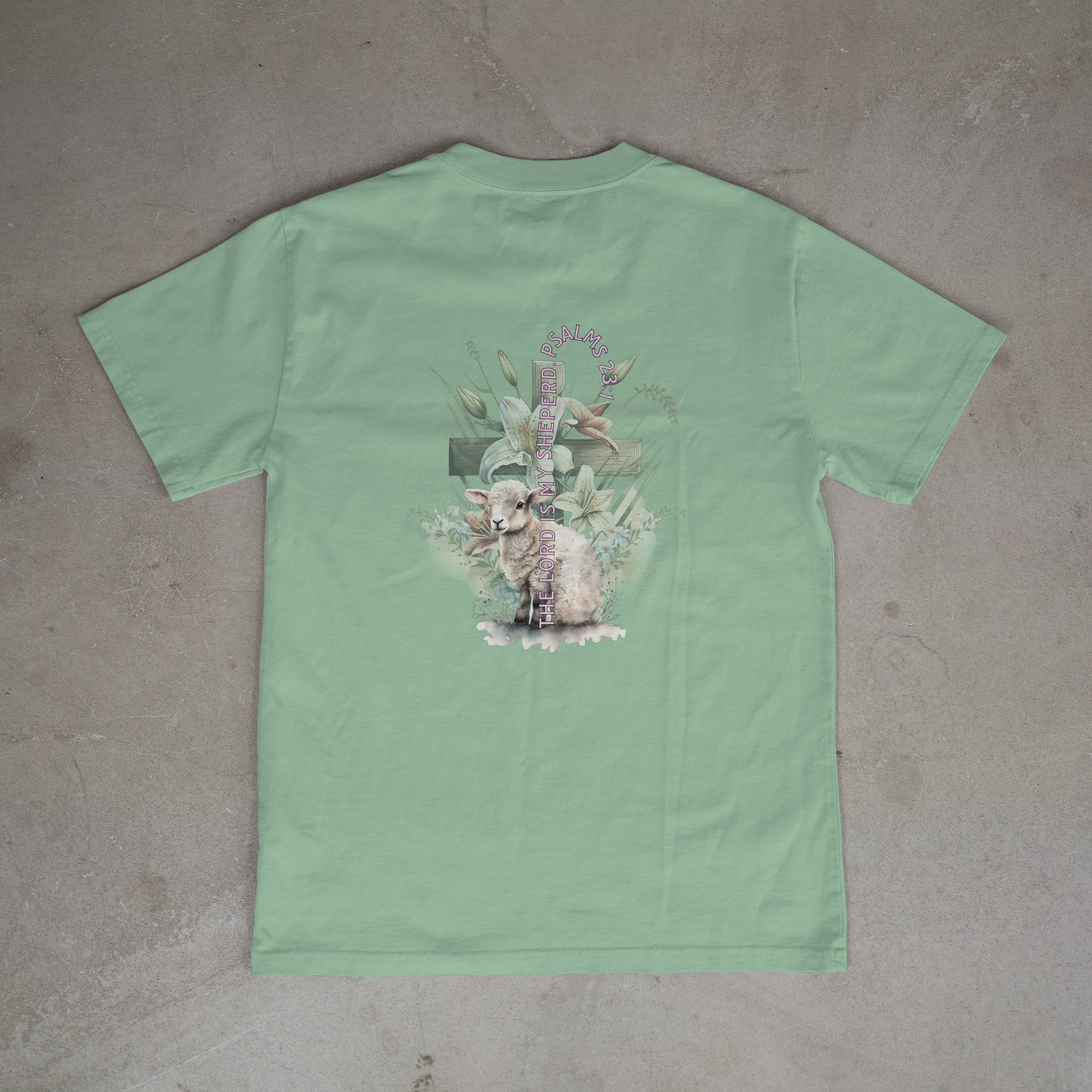 Inspired by one of the most comforting scriptures, this Psalm 23 Tee features a soft watercolor-style lamb at rest - a symbol of peace, protection, and belongings. With a gentle pastel design and a calm mint backdrop, this piece carries the heart of the shepherd who leads us besides still waters
